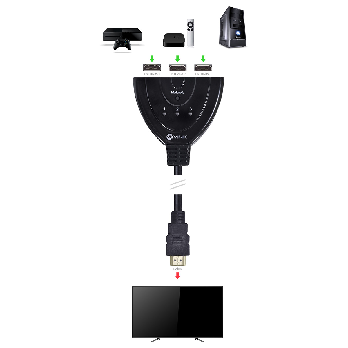 – Chega de ter que ficar trocando cabo HDMI entre Notebook, Vídeo Game e Decoder. Conheça o novo SWITCH HDMI VINIK, com este aumento do número de equipamentos em alta definição o SWITCH HDMI VINIK é uma excelente solução para TVs que possuem apenas uma entrada HDMI ou quando as entradas forem insuficientes ou de difícil acesso para conectar todos os equipamentos. O SWITCH HDMI VINIK conecta até 3 equipamentos com saída HDMI a uma única entrada HDMI da sua televisão, sem perder a qualidade de som e imagem.
